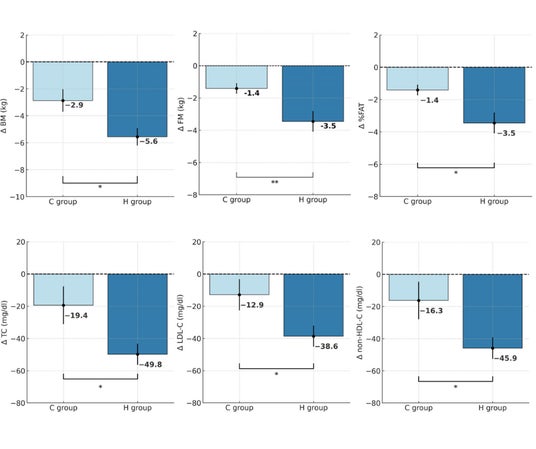 研究結果から、H群はC群と比較して、体重(-5.4% vs -2.6%、p<0.05)および体脂肪量(-14.7% vs -7%、p<0.01)において有意に大きな減少を達成した。