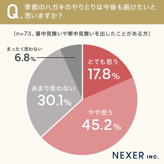45.2%が今後も季節のハガキのやり取りを続けたいと「やや思う」、17.8%が「とても思う」と回答しました。