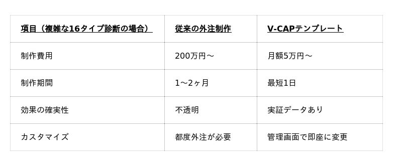 従来の「情報提供型」コンテンツから、「自己理解促進型」診断コンテンツへ。V-CAPテンプレートを活用することで、効果実証済みのフレームワークを自社のビジネスに即座に適用し、広告費に依存しない持続可能なリード獲得構造を構築できます。