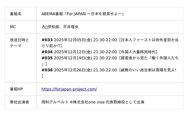 ~取締役 岡村アルベルトが、ABEMA番組「For JAPAN -日本を経営せよ-」(12月放送回)に出演、外国籍人財の受入れ等について提言。初回放送は2025年12月5日(金) 21:30~