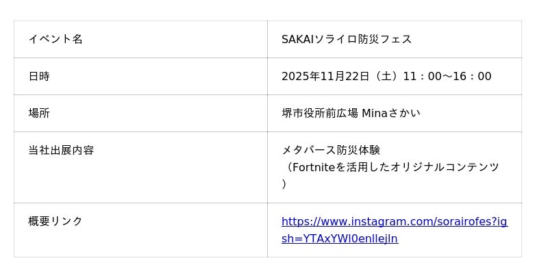 株式会社Meta Heroes(本社所在地:大阪府大阪市、代表取締役:松石和俊、以下「当社」)は、2025年11月22日(土)に堺市役所前広場 Minaさかいにて開催された体験型防災イベント「SAKAIソライロ防災フェス」への出展を無事終了いたしました。