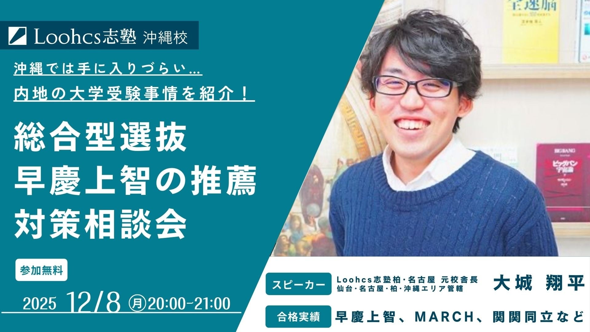 ルークス志塾沖縄校舎では、沖縄ではまだ十分な情報が得にくい総合型選抜や難関大学の推薦入試について、最新の対策を紹介する「総合型選抜 無料相談会」を12月8日(月)に開催します。大学ごとに大きく異なる総合型選抜のポイントを、関東・東海エリアで長年指導を行ってきた大城が解説。早慶上智をはじめとする難関大学を志望する受験生に向け、沖縄では得られにくい情報をわかりやすくお伝えします。