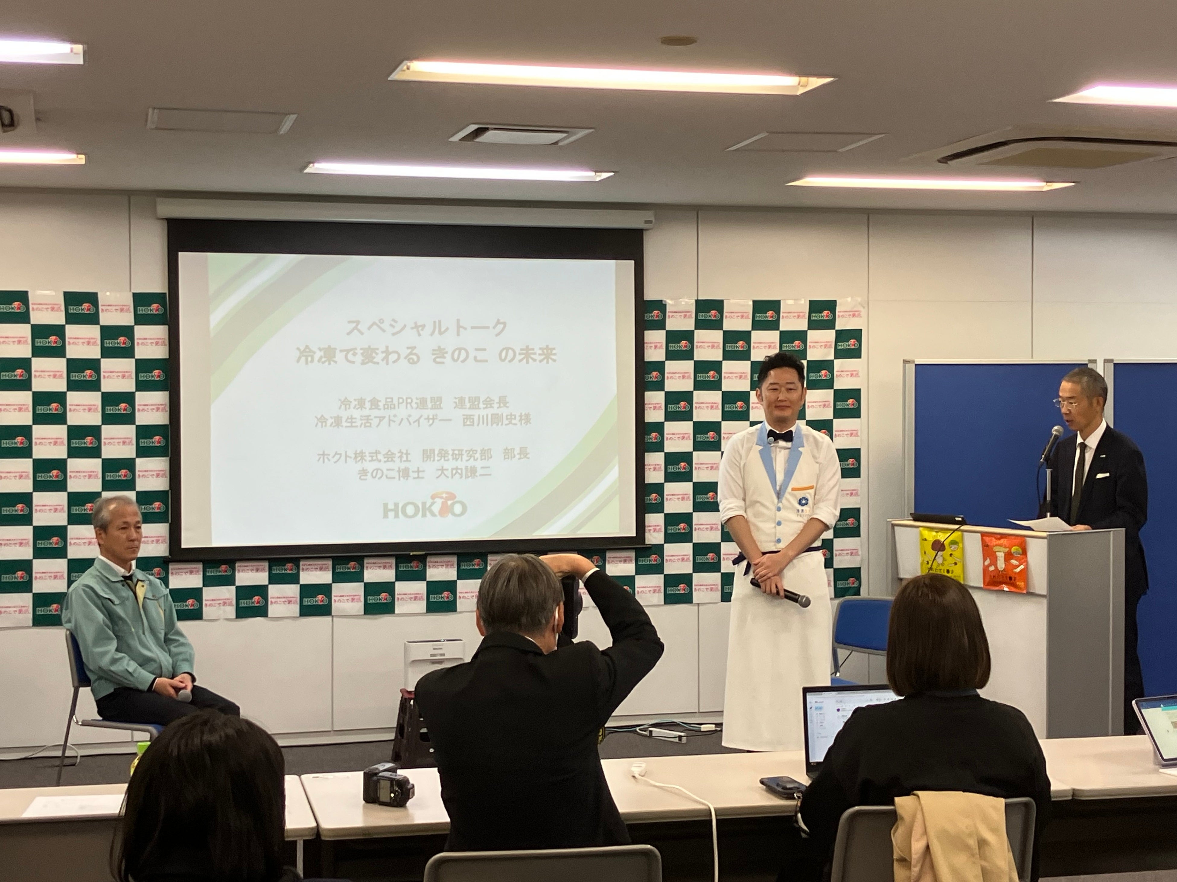 新商品プレゼンでは、工場で採れたてのきのこを急速冷凍するメリットや、500人の消費者調査に基づいて商品開発した事を説明しました。スペシャルトークでは、ゲストに冷凍王子 西川様、きのこ博士 大内(ホクト(株) 開発研究部 部長)を迎え、「冷凍で変わるきのこの未来」と題し、冷凍食品の市場伸長や、商品開発秘話等、冷凍きのこの魅力に関する対談を実施しました。