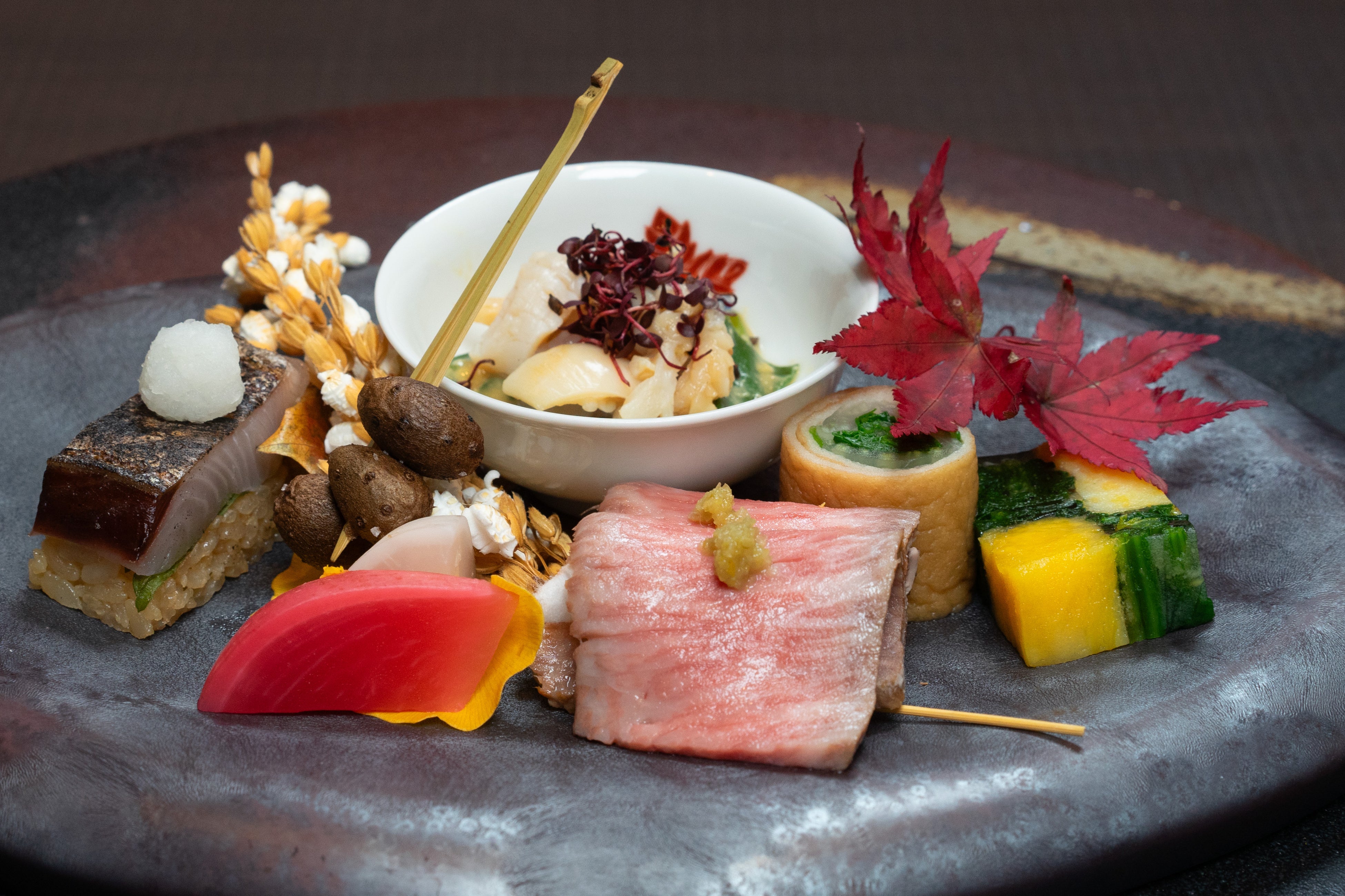 佐賀牛内もも肉を昆布締めにし、甘エビとホタテの旨味を合わせ、佐賀の有明海一番摘みの海苔を巻いて食べつ一品。