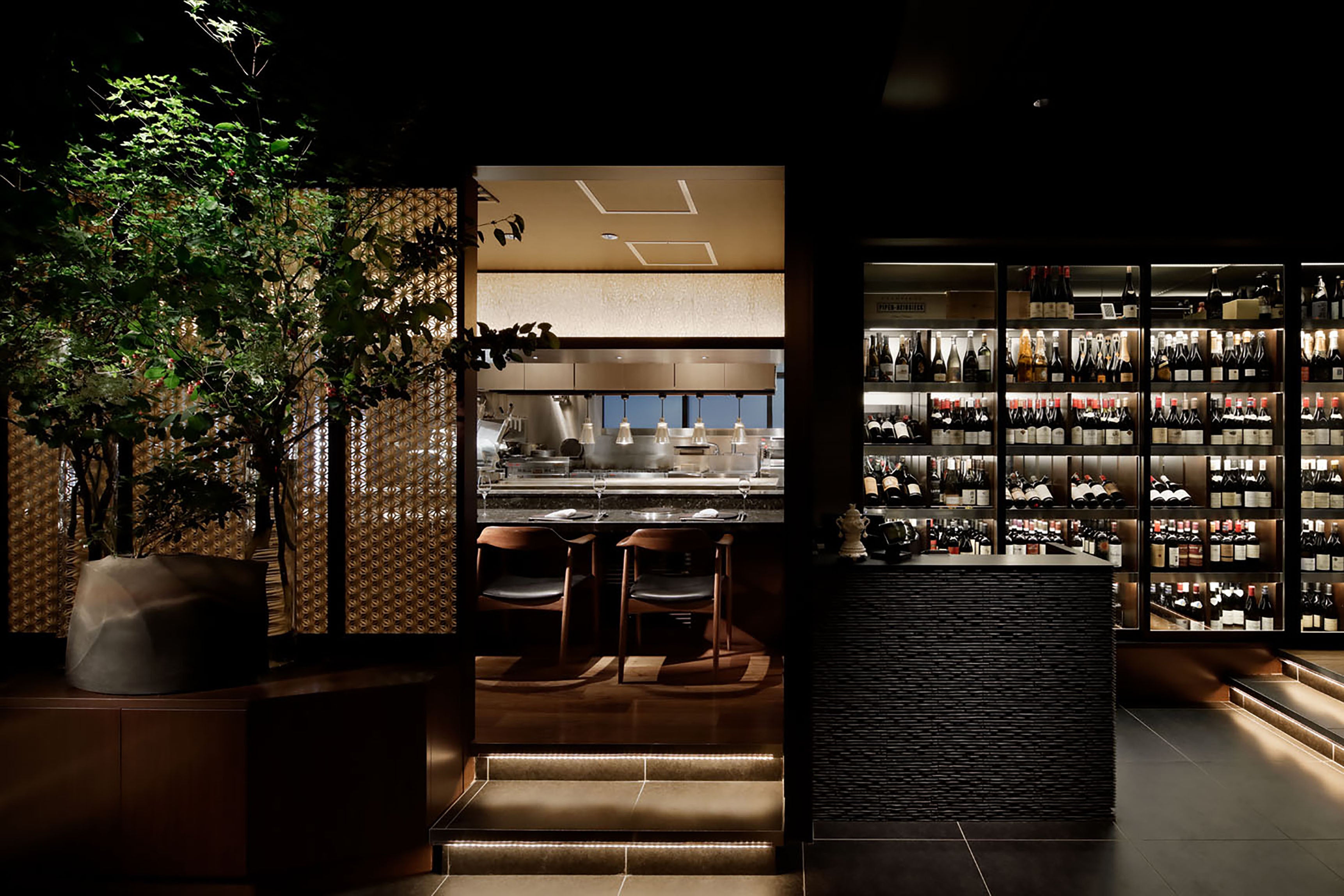 1000本以上収納のセラーのワインと日本酒。ライブ感溢れるカウンター