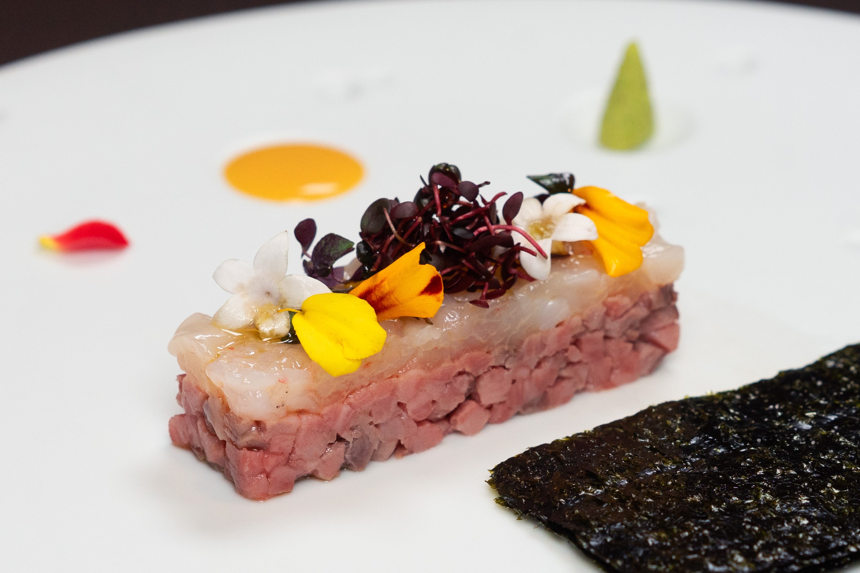 佐賀牛内もも肉の昆布〆タルタル(甘海老・帆立)