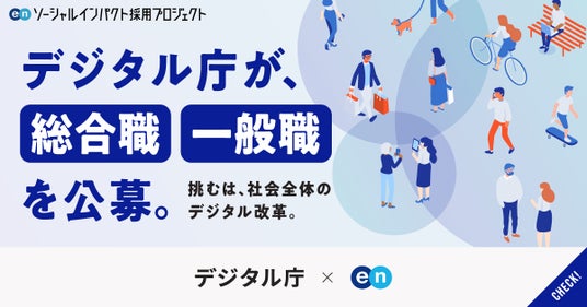 エン株式会社(本社:東京都新宿区、代表取締役会長兼社長:越智通勝)は、2025年12月4日(木)より、デジタル庁の『ソーシャルインパクト採用プロジェクト』(https://www.enjapan.com/)を開始しました。当社が運営する採用支援サービスを通じ、「総合職(課長補佐級・係長級)」「一般職(課長補佐級・係長級)」を公募します。下記本プロジェクト概要と、デジタル庁 人事チームのコメントを紹介します。