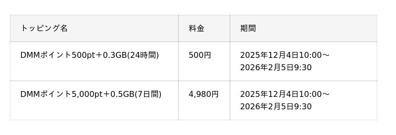 KDDI、沖縄セルラーは2025年12月4日から、povo2.0の「コラボトッピング」として、「DMMポイント500pt」と「0.3GB(24時間)」がセットになったトッピングを500円、大容量の「DMMポイント5,000pt」と「0.5GB(7日間)」がセットになったトッピングを4,980円で提供します。