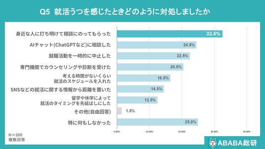 5. 対処法は「身近な人への相談」が32.5%で最多。次いで「AIチャット(ChatGPT等)に相談」が24.5%と、現代ならではの対処法が上位。一方「何もしなかった」と抱え込む学生も25.0%。