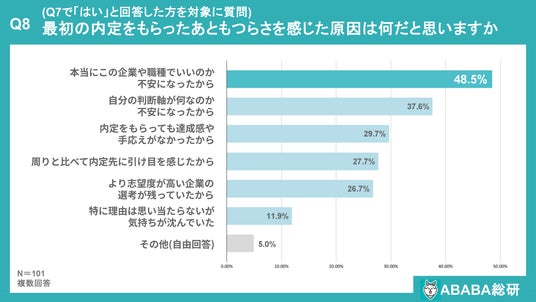 8. 内定後もつらさを感じた原因は「本当にこの企業でいいのか不安」が48.5%。「決断できないストレス」が新たな負担に。