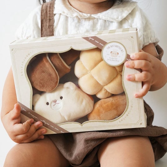 ふんわりえほんで人気の「こぐまくんの焼きたてパン」の世界観をそのままラトルにした新作シリーズ。焼きたてパンのような可愛い布製ラトル。