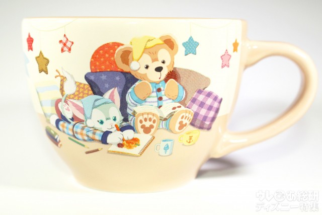 ミルクティー色のカップは、ダッフィー&フレンズの楽しいパジャマパーティの様子のイラストです。