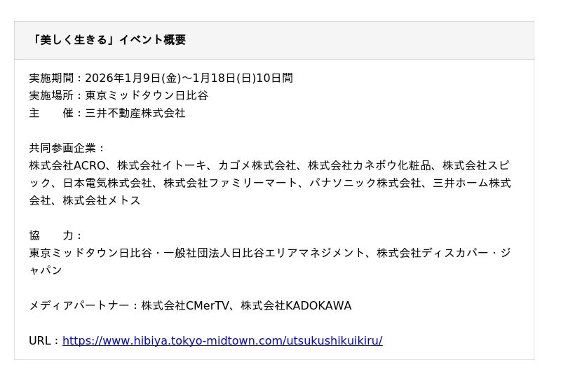 三井不動産株式会社(東京都中央区、代表取締役社長:植田俊、以下「三井不動産」)は東京ミッドタウン日比谷(千代田区有楽町)で、2026年1月9日(金)~18日(日)の10日間、10社の共同参画企業とウェルネスイベント「美しく生きる」を開催いたします。