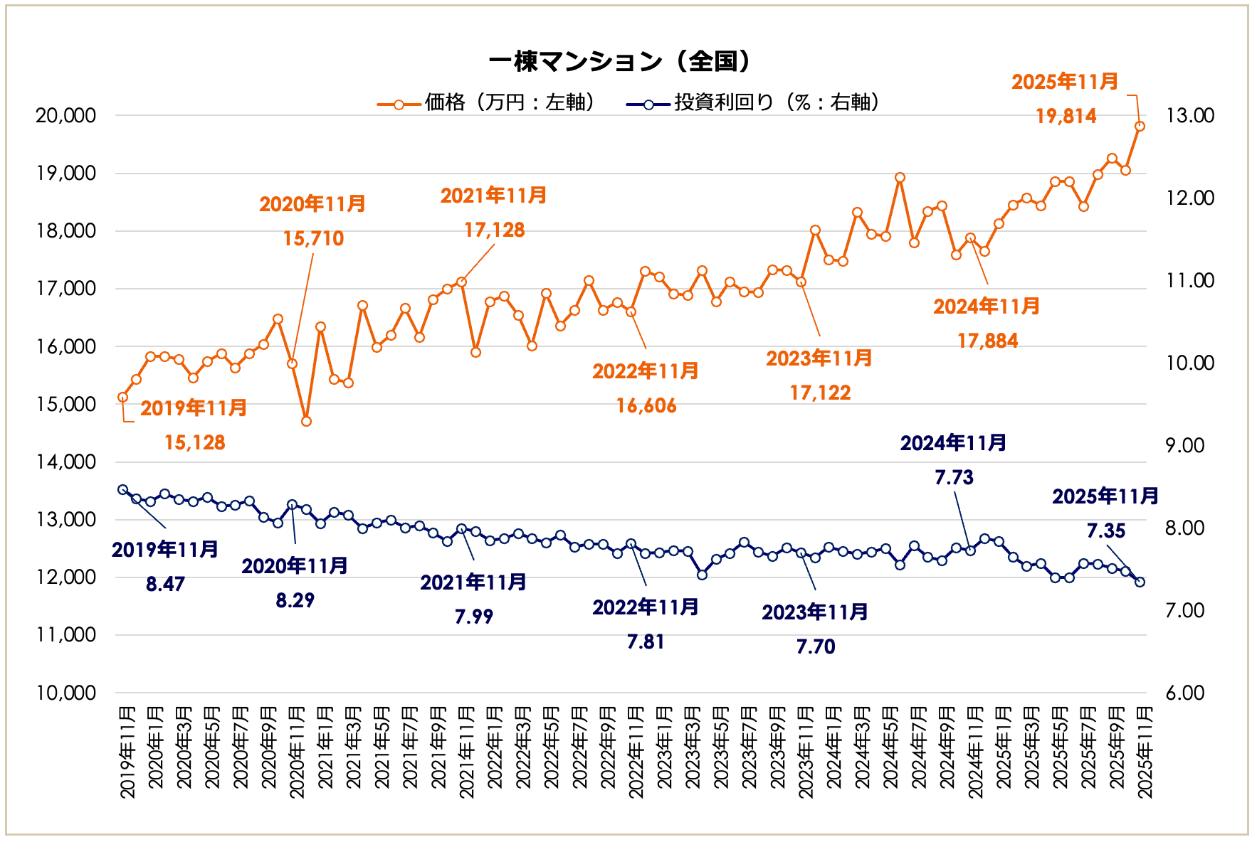 2025年11月期の一棟マンション市場(全国平均)は、価格の上昇基調が一段と強まる結果となりました。全国平均価格は19,814万円となり、前月比+4.00%と大きく上昇しました。前年同月(17,884万円)と比較しても+10.79%の上昇となっており、高水準が継続しています。一方、全国平均利回りは7.35%で、前月比-0.13ポイント、前年同月比でも-0.38ポイントと、低下傾向が続いています。