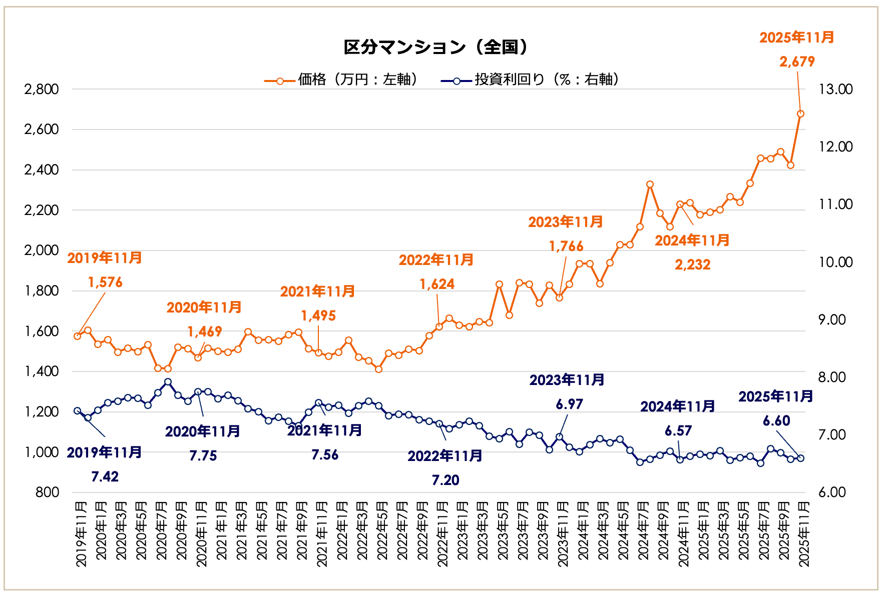 2025年11月期の区分マンション市場(全国平均)は、価格の高騰が際立つ結果となりました。全国平均価格は2,679万円で、前月比で+10.57%と二桁の上昇を記録。前年同月比でも、+20.03%と高水準が継続していることがわかります。一方、全国平均利回りは6.60%で、前月比+0.02ポイント、前年同月比でも+0.03ポイントと横ばいで推移しました。