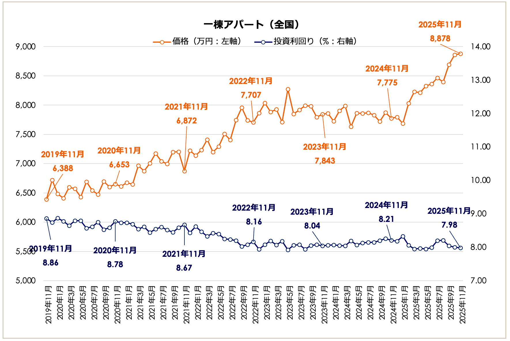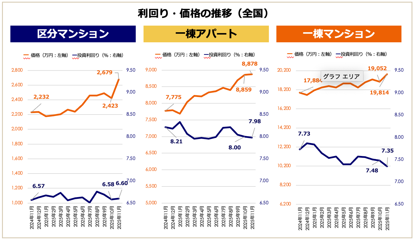 2025年11月期は、区分マンションが前月比+10.57%と急伸したほか、すべての物件種別で直近12年※での最高価格を更新しました。これにともない、一棟マンションや一棟アパートの利回りは全体として低下傾向にあります。