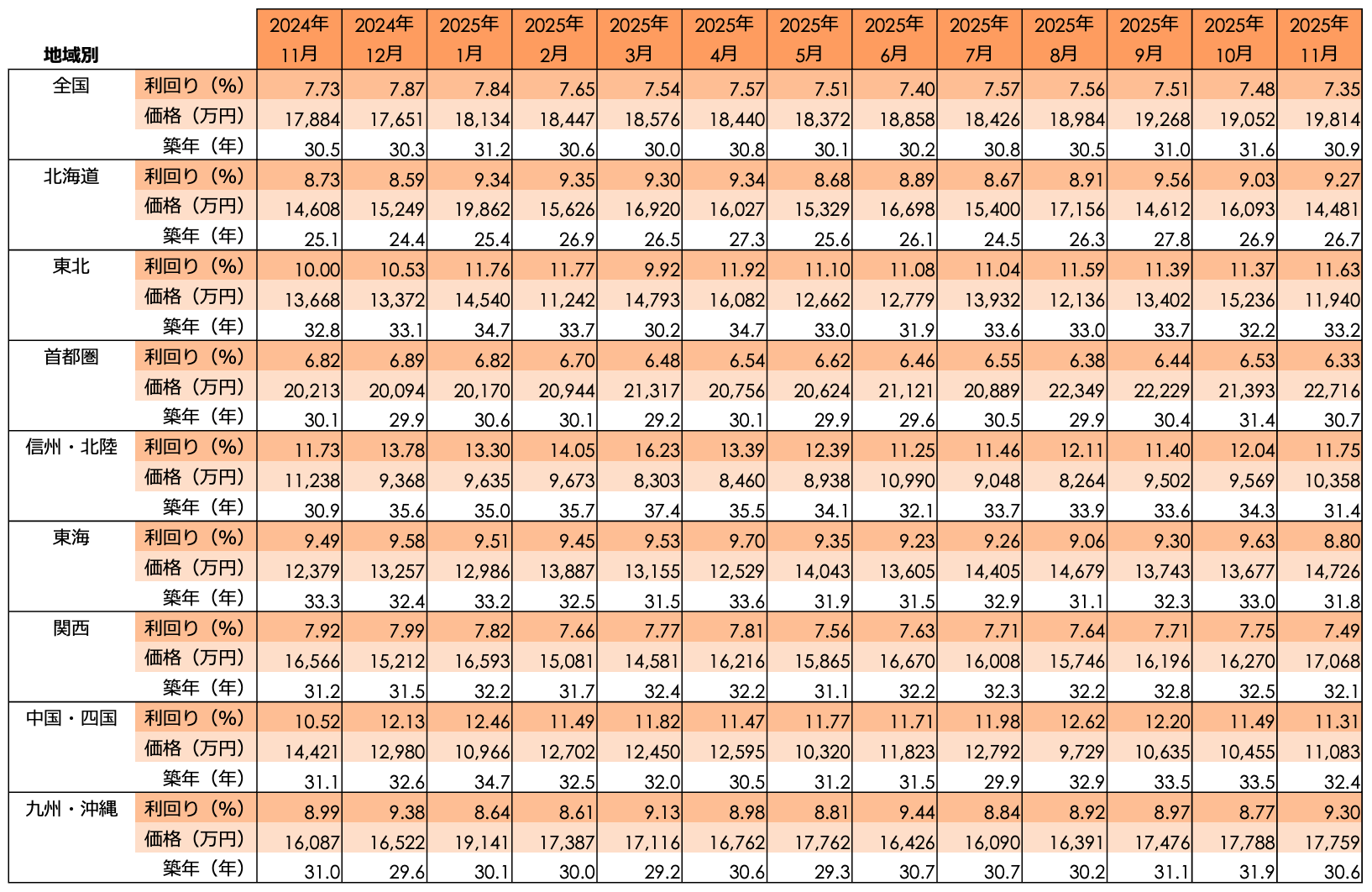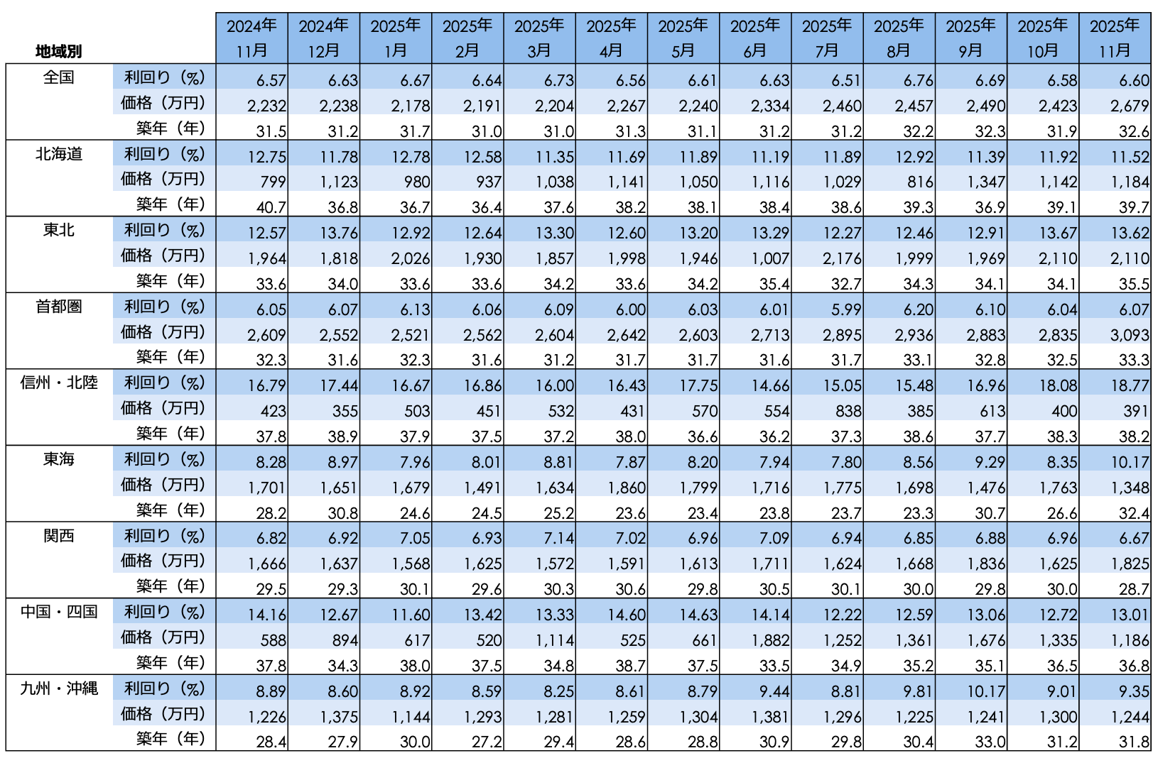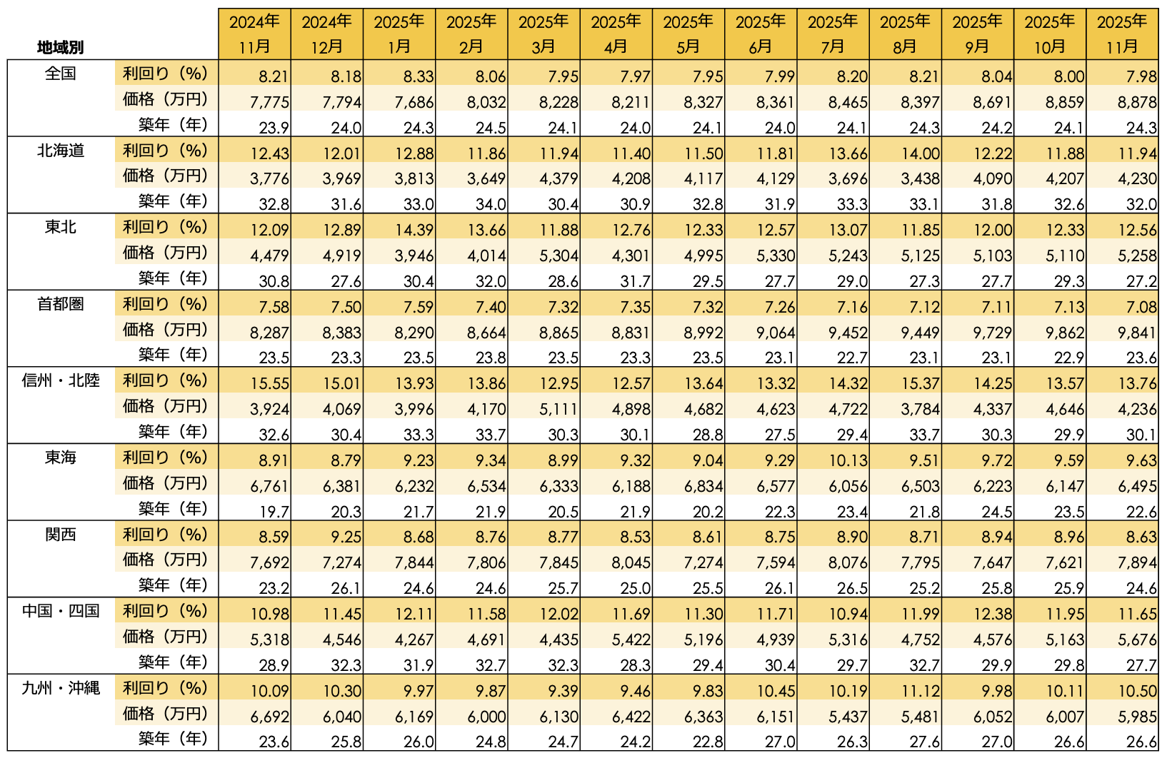 地域別の利回りに目を向けると、首都圏では価格が前年同期比で大きく上昇しているものの、利回りの低下は前月比-0.05ポイント、前年同月比で-0.50ポイントと、価格上昇に伴う標準的な調整にとどまっています。一方で、最も高い利回りだった信州・北陸(13.76%)では、価格が前年同月比+7.95%の上昇に対し、利回りが同-1.79ポイントと全地域の中で最も大きく低下しており、この地域における投資指標の変動の大きさが際立つ結果となりました。