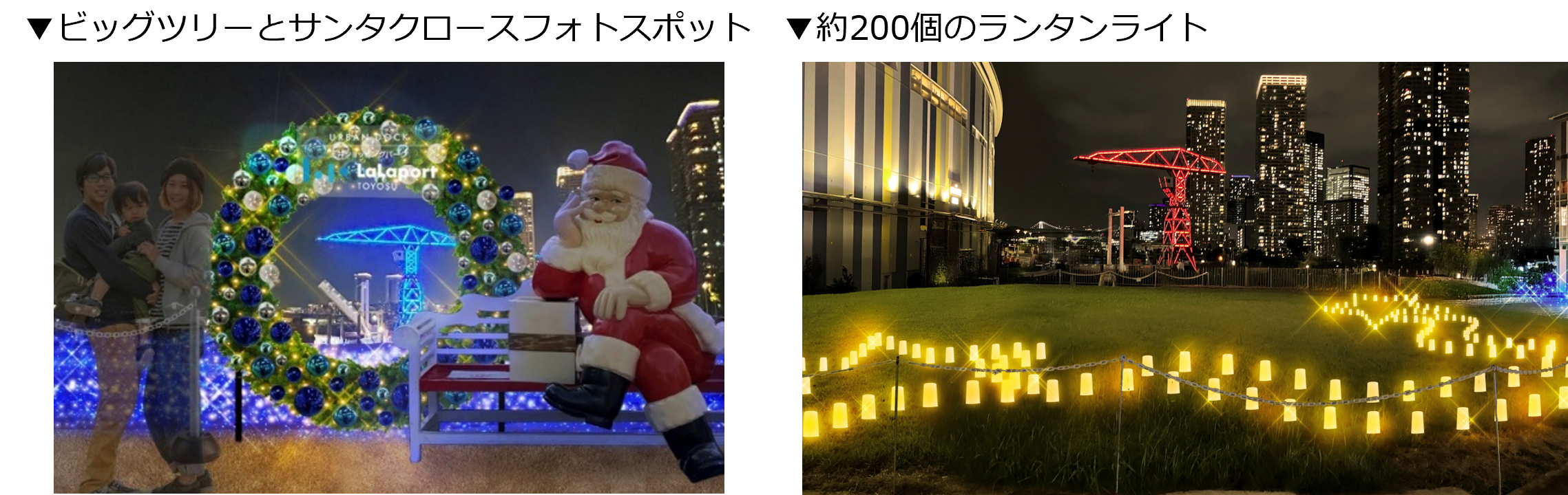 アーバンドック ららぽーと豊洲に広がるきらめく光の海岸。美しい夜景と調和し、穏やかな波のように明滅するイルミネーションが織りなす幻想的な空間で、サンタクロースと一緒に楽しい思い出を作りましょう。アーバンドック ららぽーと豊洲ならではの演出で家族の絆を深める特別なクリスマスをお届けします。芝生エリアには、館内で実施したワークショップにてお客様に作成いただいた作品を展示します!さらに、アルバルク東京所属の選手や、ららぽーと豊洲にてリリースイベントを開催したアーティストがサインやイラストを描いたオリジナルのランタンライトも展示!