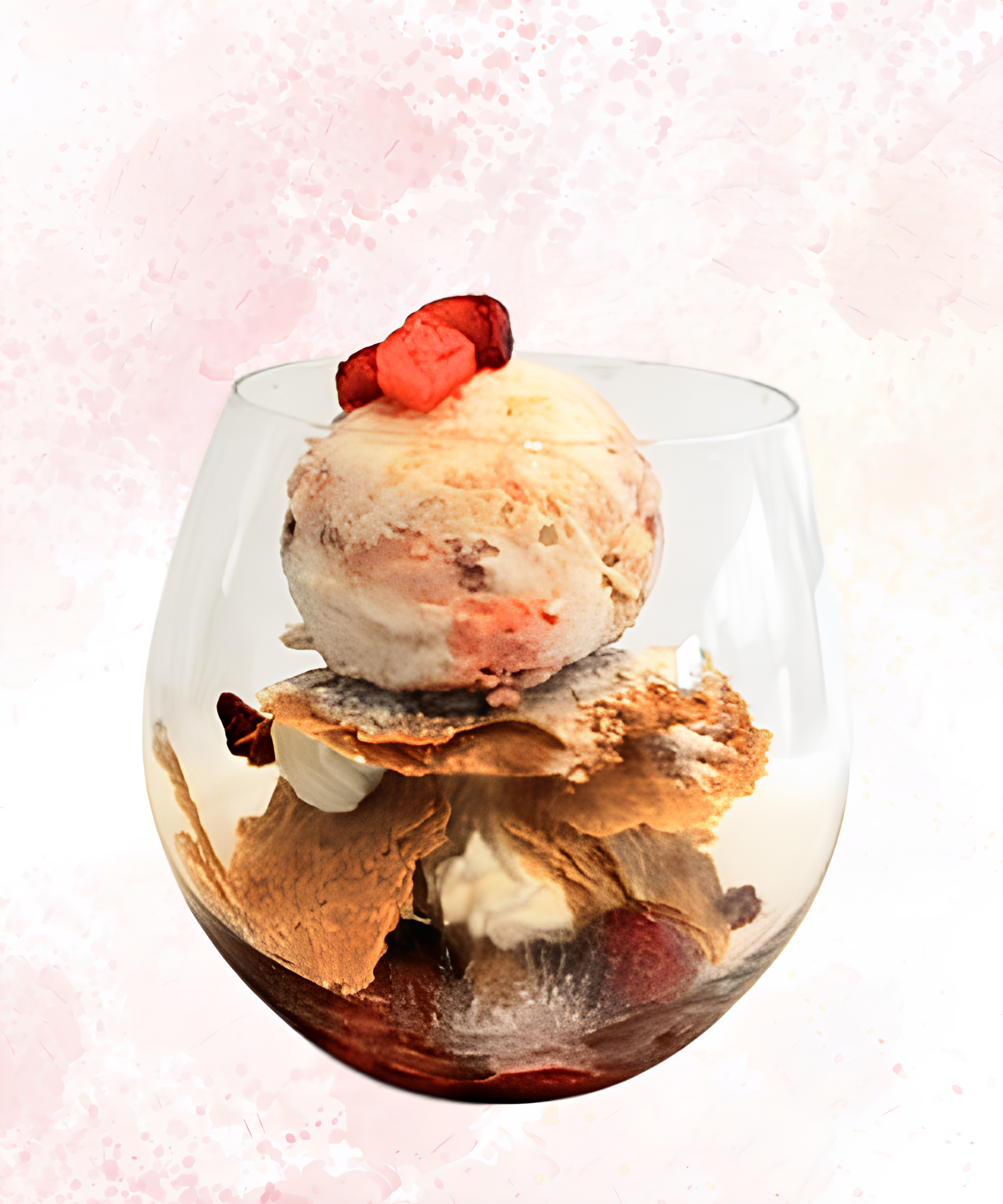 パイ生地サクサクのミルフィーユグラスの中はサクサクのパイ生地とイチゴのショートケーキアイス。スノードームのような可愛らしいデザート。