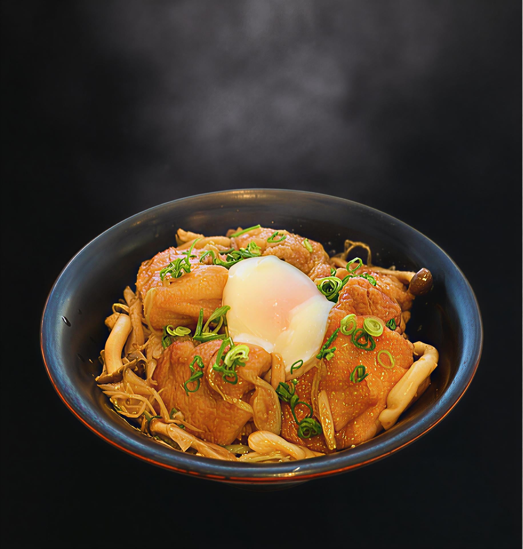 サウナ飯第9弾!温玉ガリバタチキン丼たっぷりキノコとがっつりガーリックの利いたバターチキンが乗ったパワーチャージに持って来いのサウナ飯。
