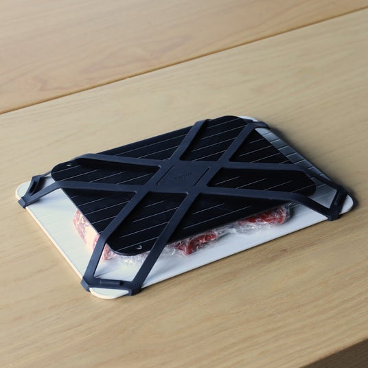 解凍プレートとは?アルミの“熱伝導性”を利用して、自然解凍より早く・ムラを抑えて解凍できるプレート解凍プレートは、アルミの持つ 高い熱伝導性 を利用して冷凍食材を“自然解凍より早く、ムラを抑えて” 解凍できる調理ツールです。