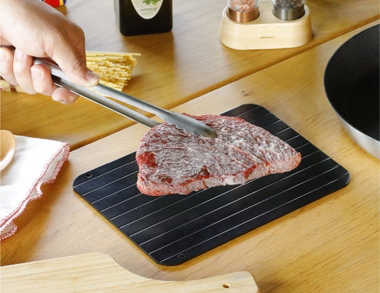 冷凍食材を置くと、食材の温度がアルミへ移動し、その反応としてアルミ側から熱が食材へ戻る「熱交換」が起こることで解凍がスムーズに進みます。