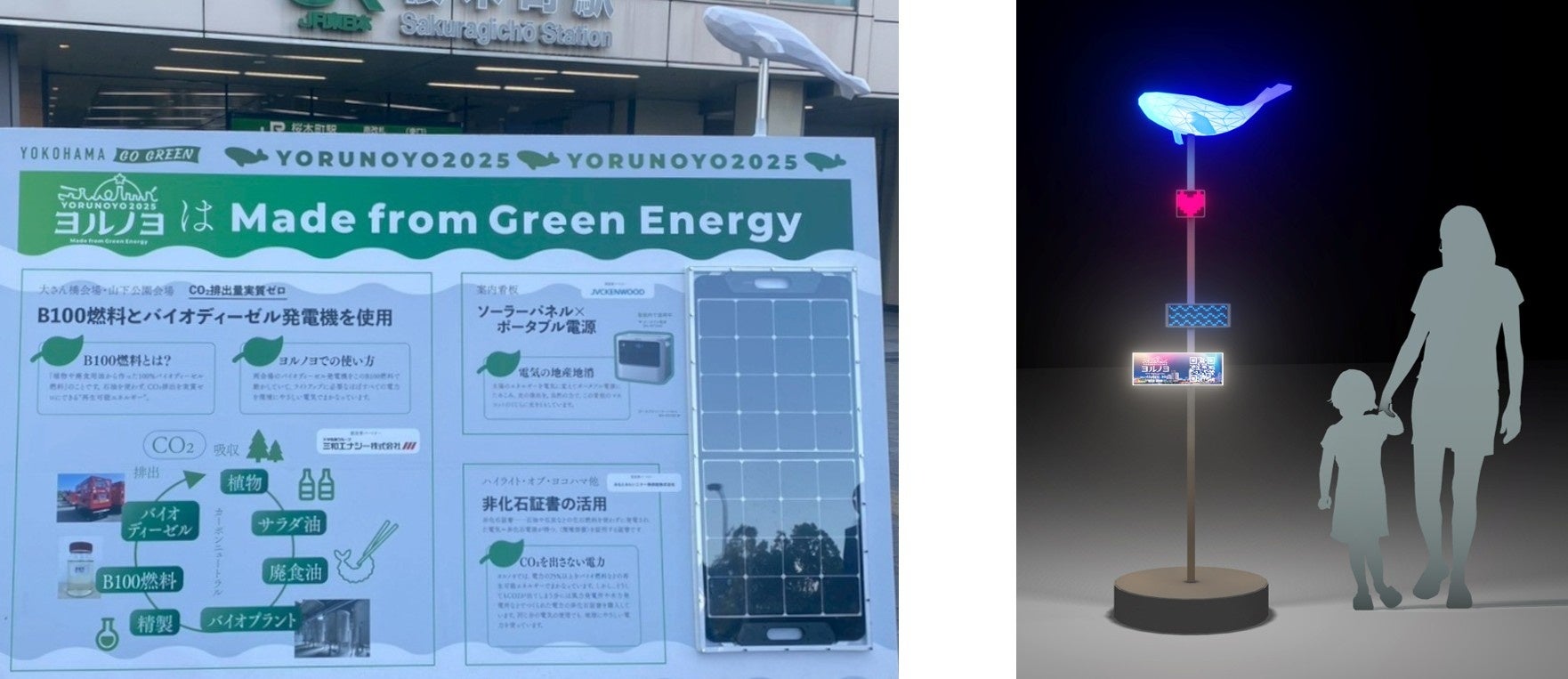 <左:桜木町駅前における「特大サイン看板」右:横浜都心臨海部に設置予定の「クジランプ」イメージ図(電源として供給)>