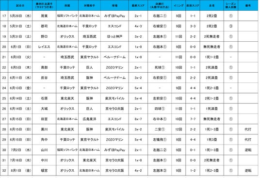 この試合、北海道日本ハム先発の山崎福也投手、埼玉西武先発の今井投手、共に8回まで無失点投球と息詰まる投手戦となる。9回からは両チームリリーフ陣が完璧な継投でスコアボードには0が並ぶ。迎えた延長12回裏、北海道日本ハムは二死走者なしから、万波選手が四球で出塁。1点が欲しいベンチは、代打に郡司選手、一塁ランナーに代走松本剛選手を送る。2球目に、松本剛選手が盗塁を決め、二死二塁とし、打席の郡司選手に全てを託す。追い込まれてからの4球目を捉えると、打球はライトスタンドに吸い込まれ、劇的なサヨナラ2点本塁打となった。土壇場からの一振りで延長12回の激闘に終止符を打った。