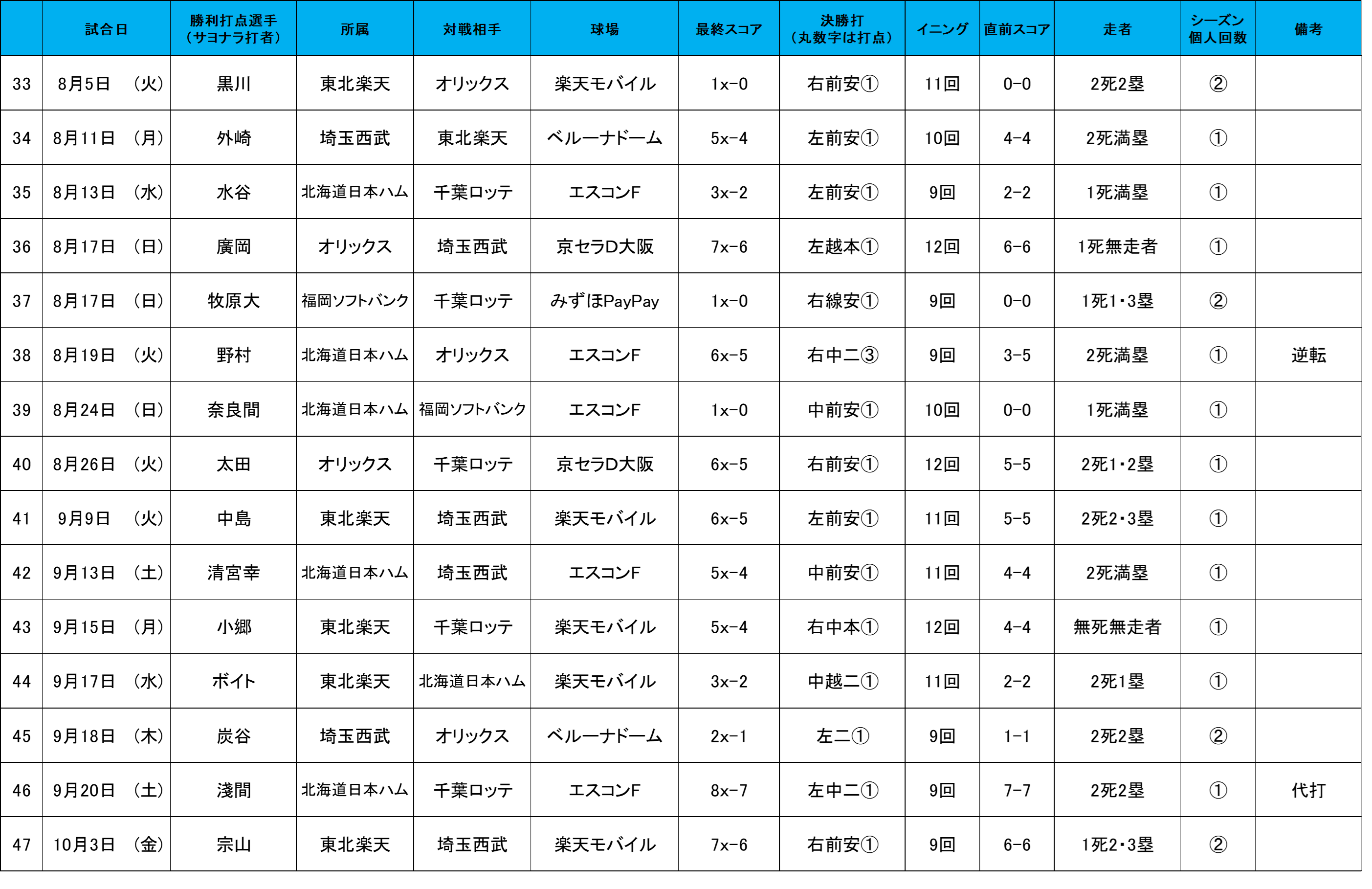【パーソル パシフィック・リーグ 公式戦 2025 サヨナラ試合一覧 全47試合】