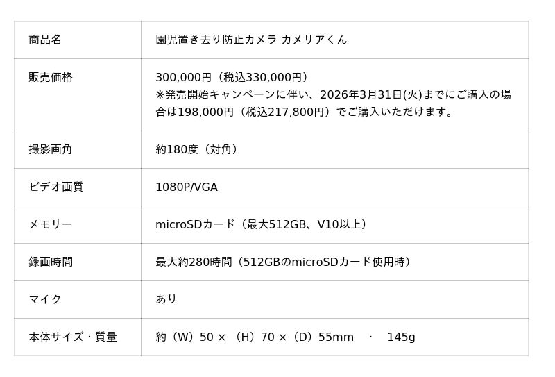 SDエンターテイメント株式会社(本社:北海道札幌市、代表取締役社長:高橋 誠、東証スタンダード4650)の連結子会社であるエムシーツー株式会社(本社:東京都新宿区)は、保育園・幼稚園向けに、「園児置き去り防止カメラ カメリアくん」を開発し、本日より販売を開始しました。