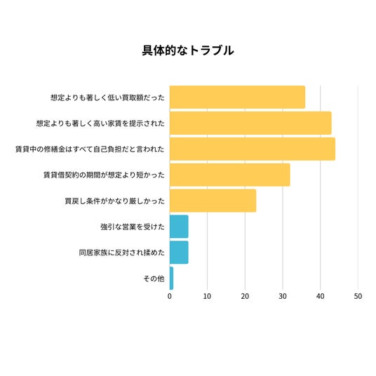 修繕金や家賃、買取金額についてのトラブルが多く見られた結果に何らかのトラブルや不満、困った経験があったと回答した方に、さらに具体的なトラブル内容を複数回答式で聞いたところ、トラブルの上位は「賃貸中の修繕金はすべて自己負担だと言われた」「想定よりも著しく高い家賃を提示された」「想定よりも著しく低い買取額」といったものとなりました。