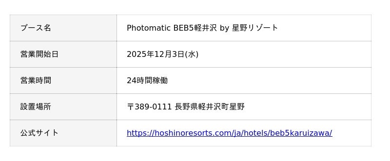 キタムラ・ホールディングス グループのピックハイブ株式会社(本社:東京都新宿区、代表取締役社長 兼 COO:大迫 由典)が運営するセルフフォトブランド「Photomatic(読み:フォトマティック)」は、2025年12月3日(水)より星野リゾートが運営する「BEB5軽井沢 by 星野リゾート」に、ホテル・宿泊施設への設置としては初めてとなるセルフフォトブースの設置を開始いたしました。