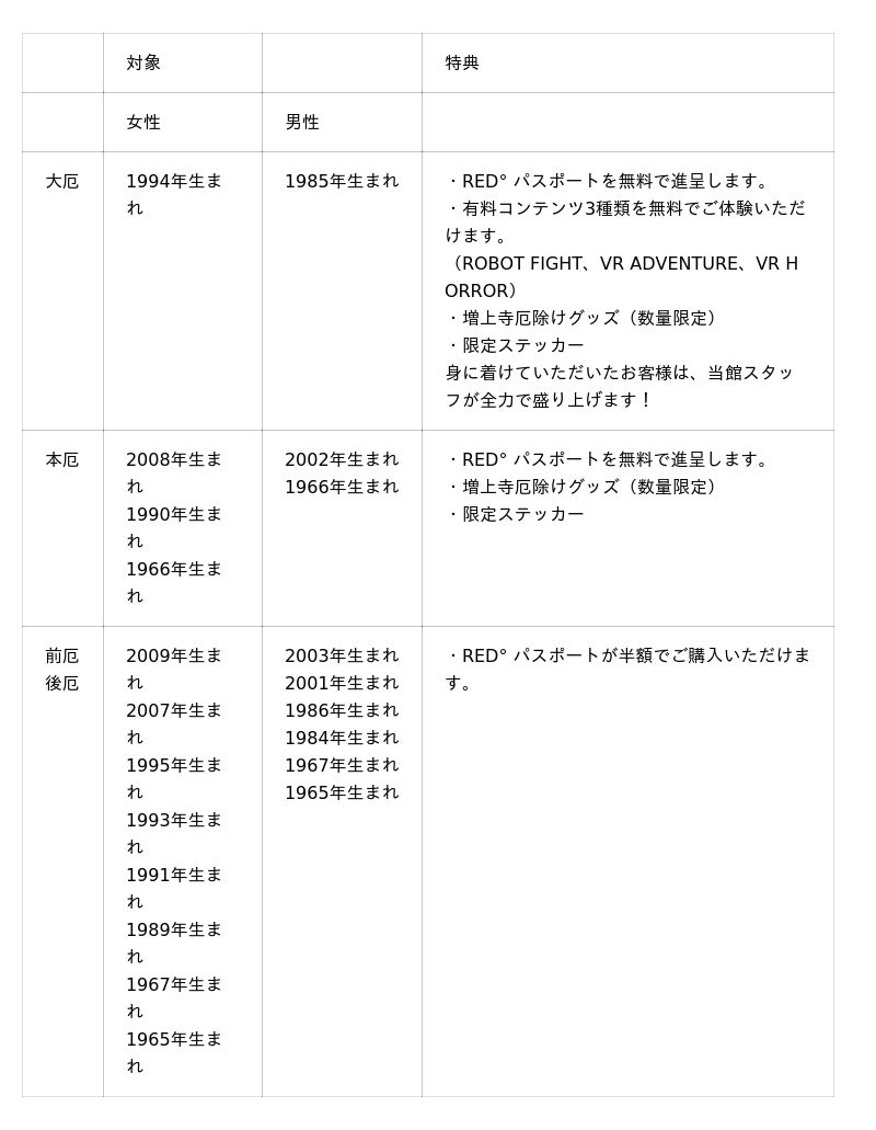 さらに今回は、“遊び初め”をより気軽に楽しんでいただけるよう、お得なチケットをご用意しました。厄年の種類に応じて、増上寺の厄除けグッズ、RED°パスポートなどをプレゼントします。