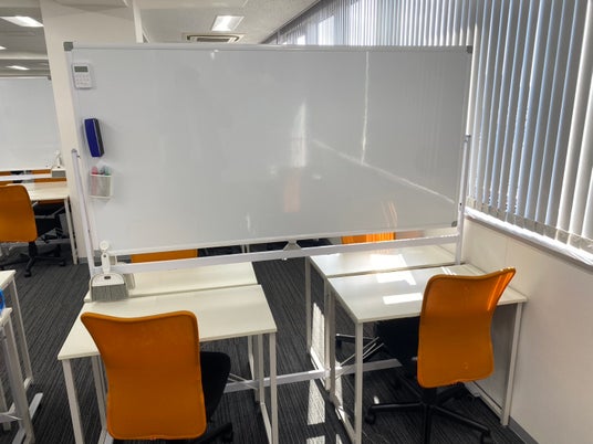 一人ひとりの学習スペースには大きなホワイトボードを完備。複雑な問題の思考過程を図解したり、目の前で要点を書き出しながら解説をするなど「勉強に集中できる」プロセスを可視化することで、より深く、効率的な学習を促します。個別ブースではないので、周りの生徒の頑張りを肌で感じつつも、集中して自分の勉強に取り組める環境となっています。