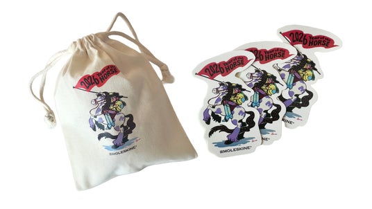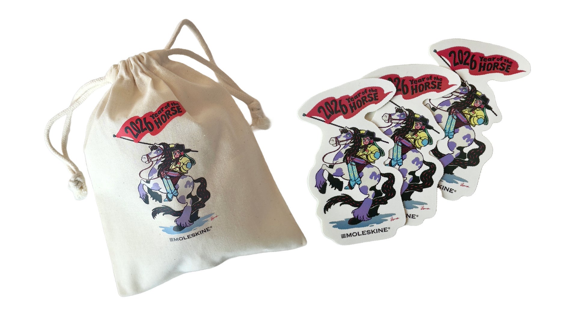 さらに、モレスキンストアにて、新年の午年を記念した巾着とステッカーをプレゼント。イラストレーター鈴木夏菜氏による描き下ろしデザインを採用し、ノートブックや手帳など彩るアイテムとなります。 数量限定につき、なくなり次第終了。