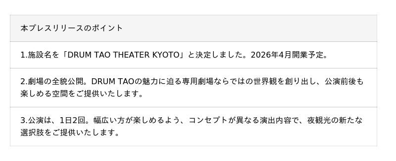 1. 施設名称は『DRUM TAO THEATER KYOTO』、開業は2026年4月に予定。