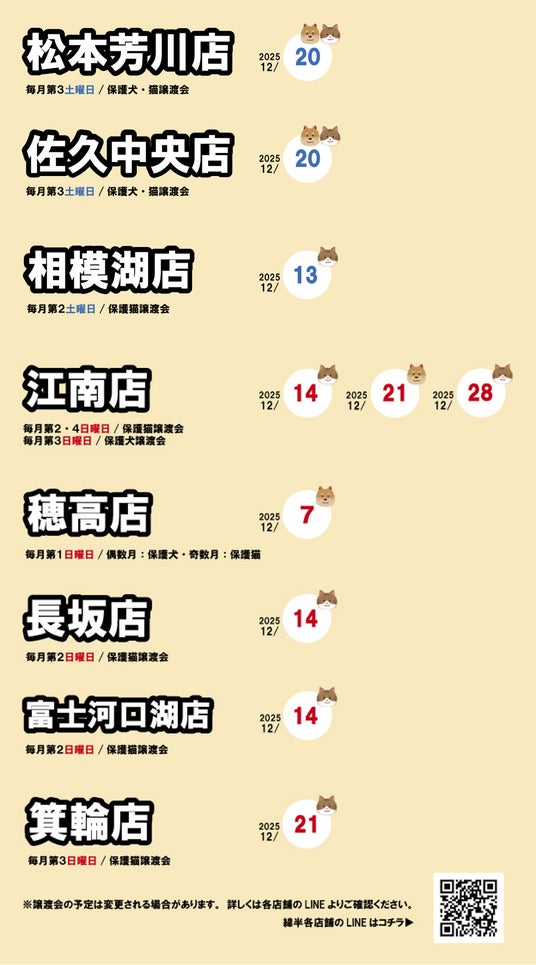 綿半パートナーズ株式会社(長野県飯田市 代表取締役社長:野原佳代子)はこの度、長野・山梨・愛知・神奈川の綿半店舗にて保護犬・保護猫の譲渡会を実施します。