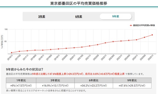 1.マンションナビのデータをもとに、9年前(2016年)の価格推移と比較