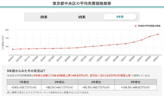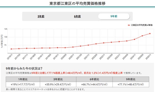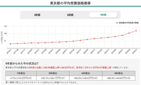 2.2025年11月時点での東京都全体のマンション価格は9年前と比較して68.9%上昇し、堅調な右肩上がりが継続