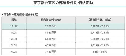 台東区は35.1%を占めた1R・1Kが最も多く、販売価格中央値は2,270万円と、単身者向けのコンパクト住戸に寄った市場構造となっており、高い流動性を持つ市場です。