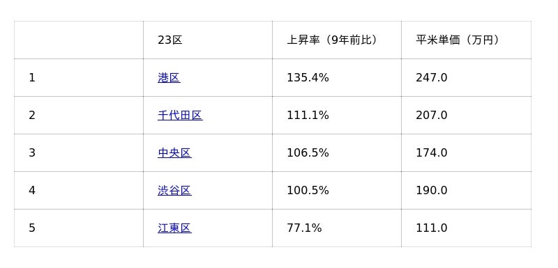 中央区は9年前と比較し106.5%という高い上昇を記録し、23区の上昇率ランキング3位です。銀座・日本橋といった日本を代表する商業エリアをかかえることに加え、晴海・勝どき・月島などの湾岸エリアでの再開発が価格上昇を後押ししています。中央区は都心3区の中で最も手が届きやすく、価格に対して得られる価値が非常に高い点が評価されています。