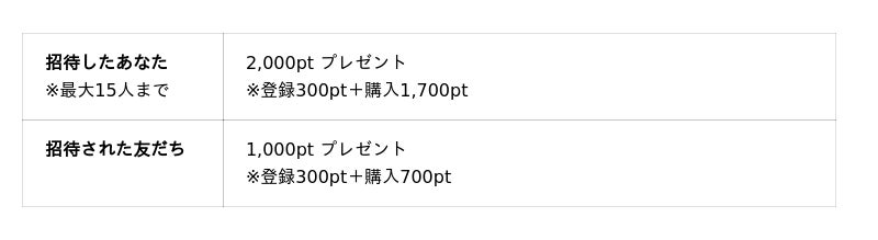 友達招待および購入で獲得できるポイントが、通常800ptのところ期間中は2,000ptに増加します。さらに、招待された友達が受け取れるポイントも、通常800ptから1,000ptへアップ!