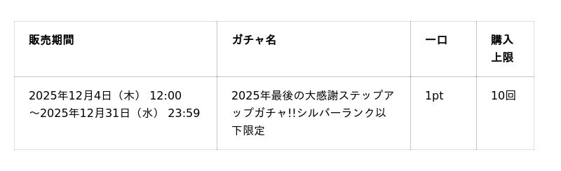2025年12月4日(木)12:00~2025年12月31日(水)23:59までの期間中、ランク別ステップアップガチャが登場します。