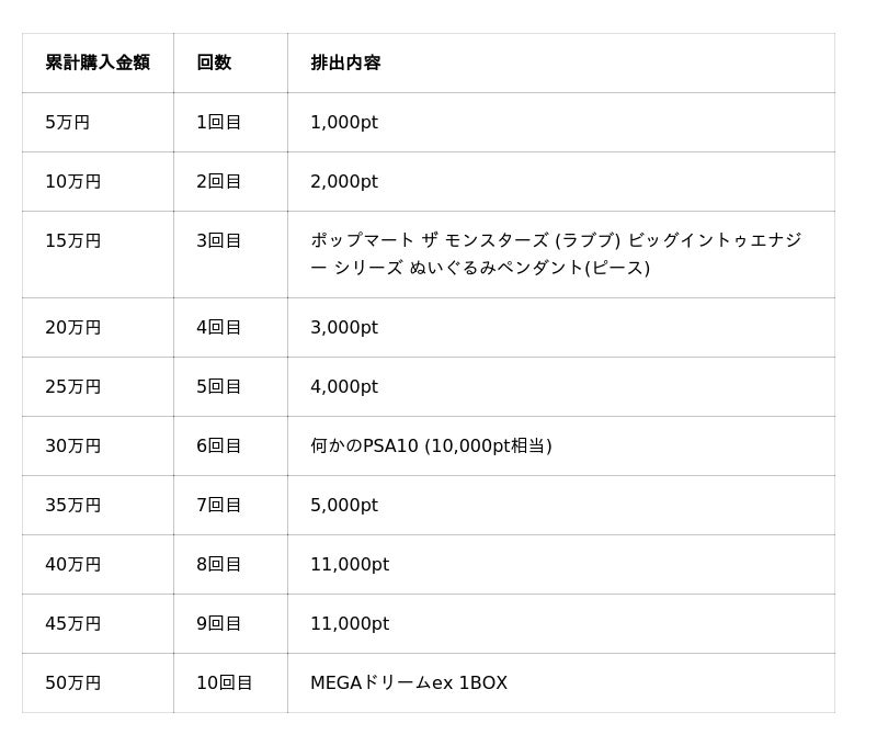 本ガチャは、累計購入金額とガチャを回す回数に応じて、豪華景品が確定で手に入る特別仕様となっており、ポケカBOXやラブブなど、超豪華な商品が確定で手に入ります。さらに、対象ガチャをすべて引き切ると「MEGAドリームex 1BOX」が確実に手に入る大チャンス!