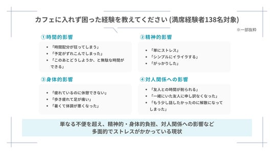 80%が「最終的にカフェ利用を諦めた経験」があり、探し続けても見つからず、利用機会を完全に失うケースも多数発生しています。