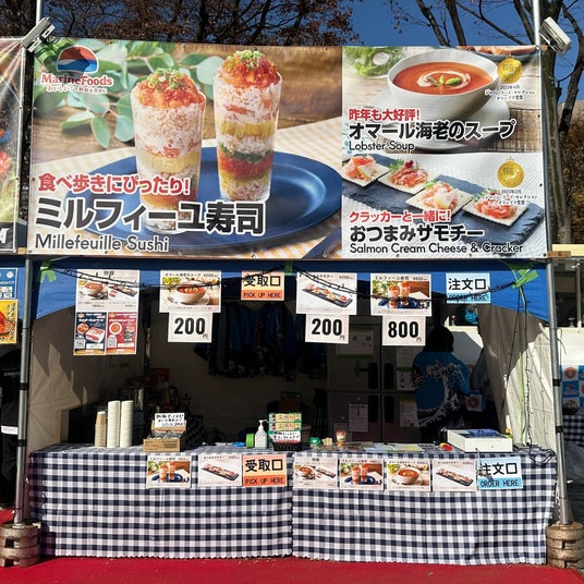 マリンフーズ株式会社(以下「マリンフーズ」)は、2025年11月28日(金)~30日(日)に開催された「SAKANA&JAPAN FESTIVAL (以下「魚ジャパンフェス」) 2025 in日比谷公園」に出店いたしました。マリンフーズブースでは、ミルフィーユ寿司・オマール海老のスープ・おつまみサモチーを販売いたしました。