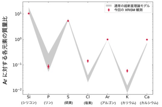 図3:XRISMによるカシオペア座Aの元素量の測定結果 (赤データ点) と理論モデル (灰色領域) との比較。通常の超新星モデルではカシオペア座Aの元素量、中でも塩素とカリウムの量を説明できないことを発見。(C)明治大学/京都大学