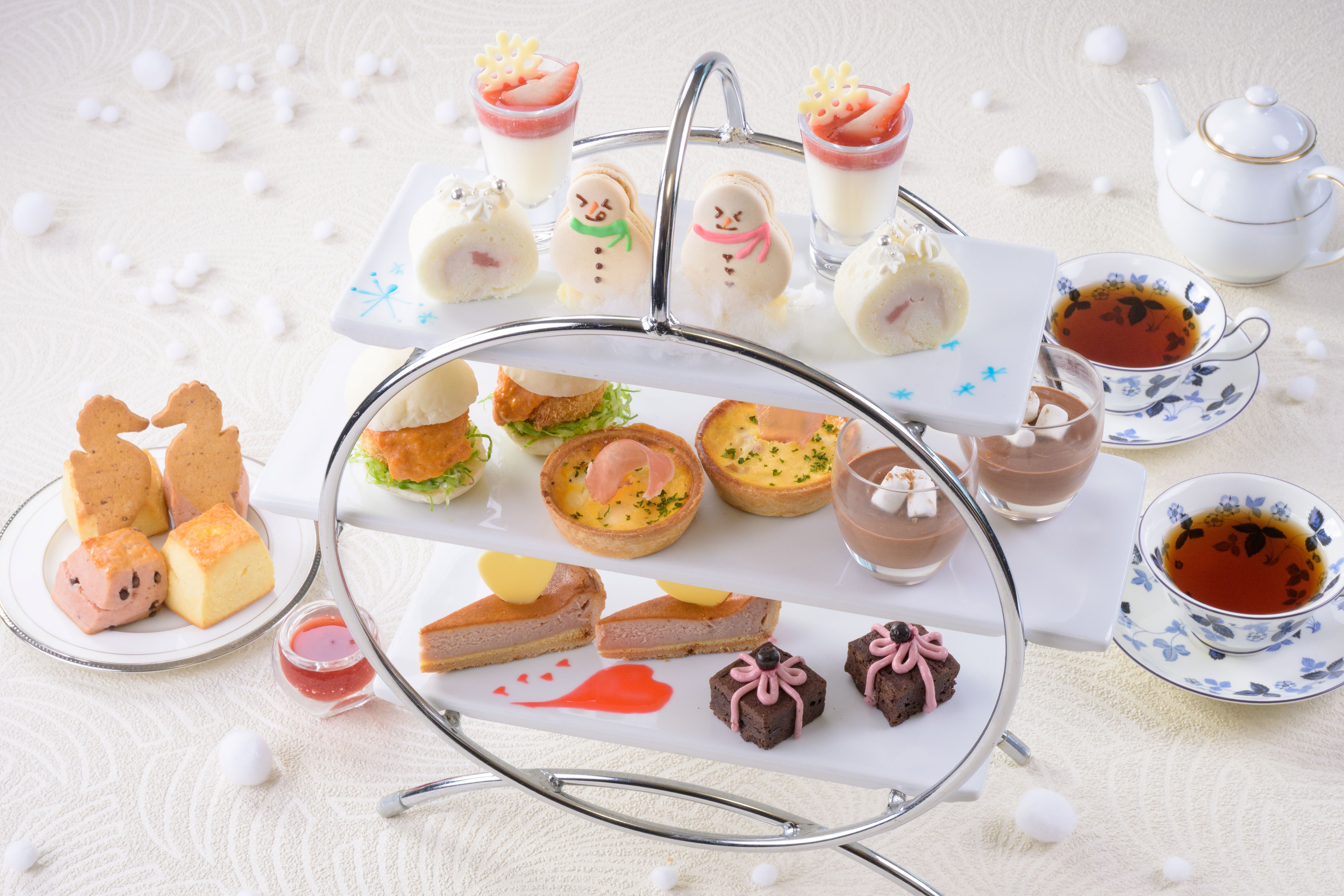 最上階「スカイレストラン ハレアス」では、クリスマスシーズン限定で、見た目にも華やかなスイーツを豊富に取り揃えました。濃厚なホワイトチョコケーキやブッシュドノエル、香ばしいパリブレスト、苺の甘酸っぱさが広がるベリーロールケーキ、定番のショートケーキやティラミスケーキなど、クリスマスにふさわしい多彩なデザートが並びます。さらに今年は、サンタやトナカイをモチーフにしたマカロンやエクレアが登場。ひと目で心が弾む可愛らしいデザインで、テーブルに並べるだけでクリスマスの雰囲気を一層盛り上げます。期間限定の心ときめく冬のスイーツコレクションをぜひお楽しみください。