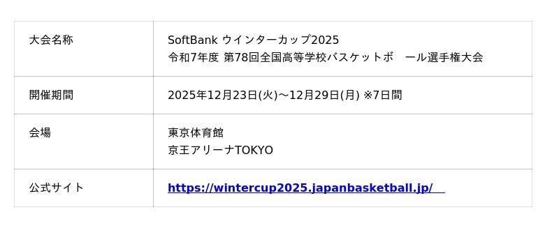「SoftBank ウインターカップ2025」(主催:公益財団法人日本バスケットボール協会、共催:公益財団法人全国高等学校体育連盟)は、各都道府県の予選を勝ち抜いた男女各60チーム、計120校によるトーナメント戦で、高校バスケットボール日本一を決める大会です。これまで本大会に出場した選手が現在も国内外で活躍しています。