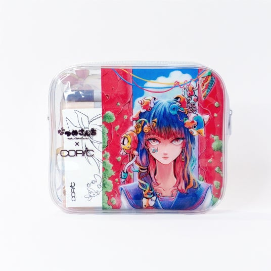 また、鮮やかな描き下ろしイラストが目をひく両面デザインのオリジナルポーチもファン必見の特製アイテムです。しっかりとした厚手のポーチでマチつきのため、コピックチャオなどのコピック製品もたっぷり収納できます。